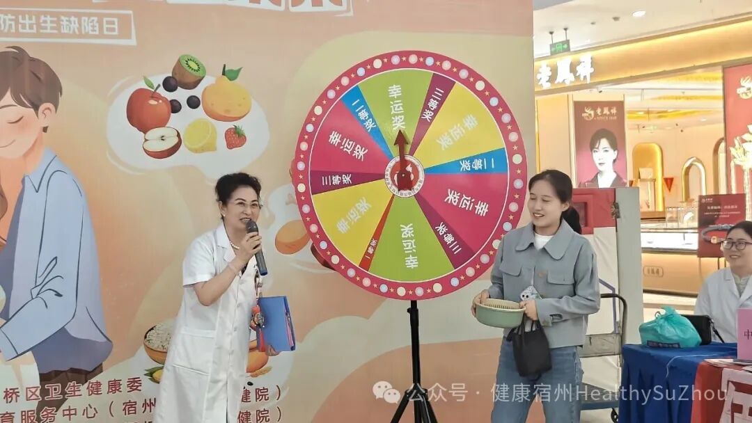 “知识问答转盘”互动环节,将活动推向高潮,市民踊跃参与,通过答题赢取小礼品,在寓教于乐中掌握孕产期保健等预防出生缺陷知识要点。