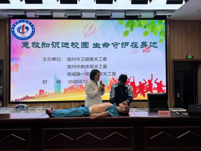 为普及急救知识与技能,提升青少年应对突发状况的自救互救能力,12月4日下午,宿州市卫生健康委关工委联合宿州市教体局关工委,组织青少年健康教育专家宣讲团,走进宿城第一初级中学浍水路校区,开展“青少年健康教育专家宣讲团进校园”主题活动。通过理论讲解、实操演示与互动体验,为学校百余名师生带来了一堂生动实用的“生命教育课”,现场气氛热烈,学习热情高涨。